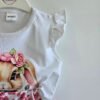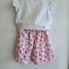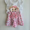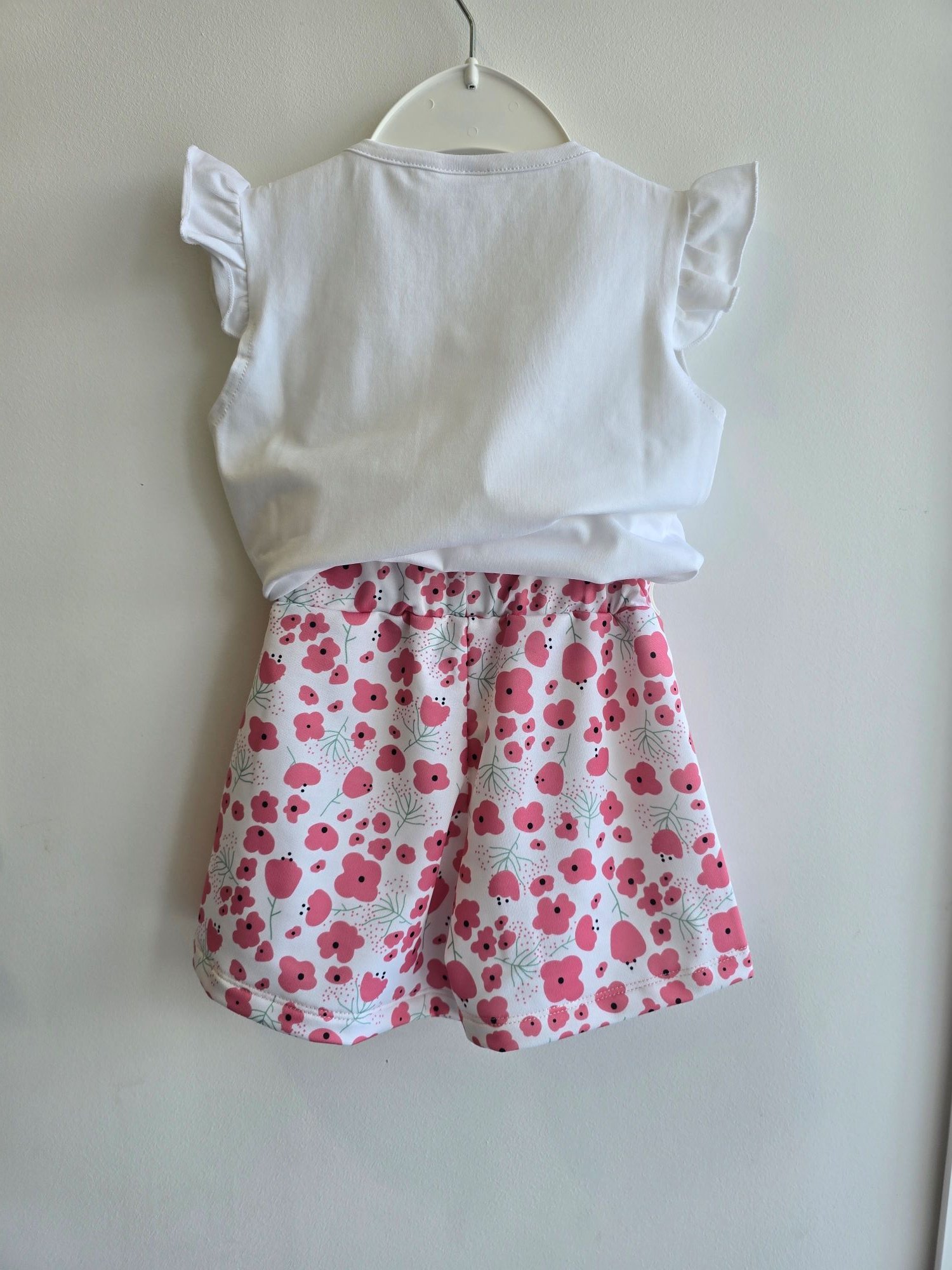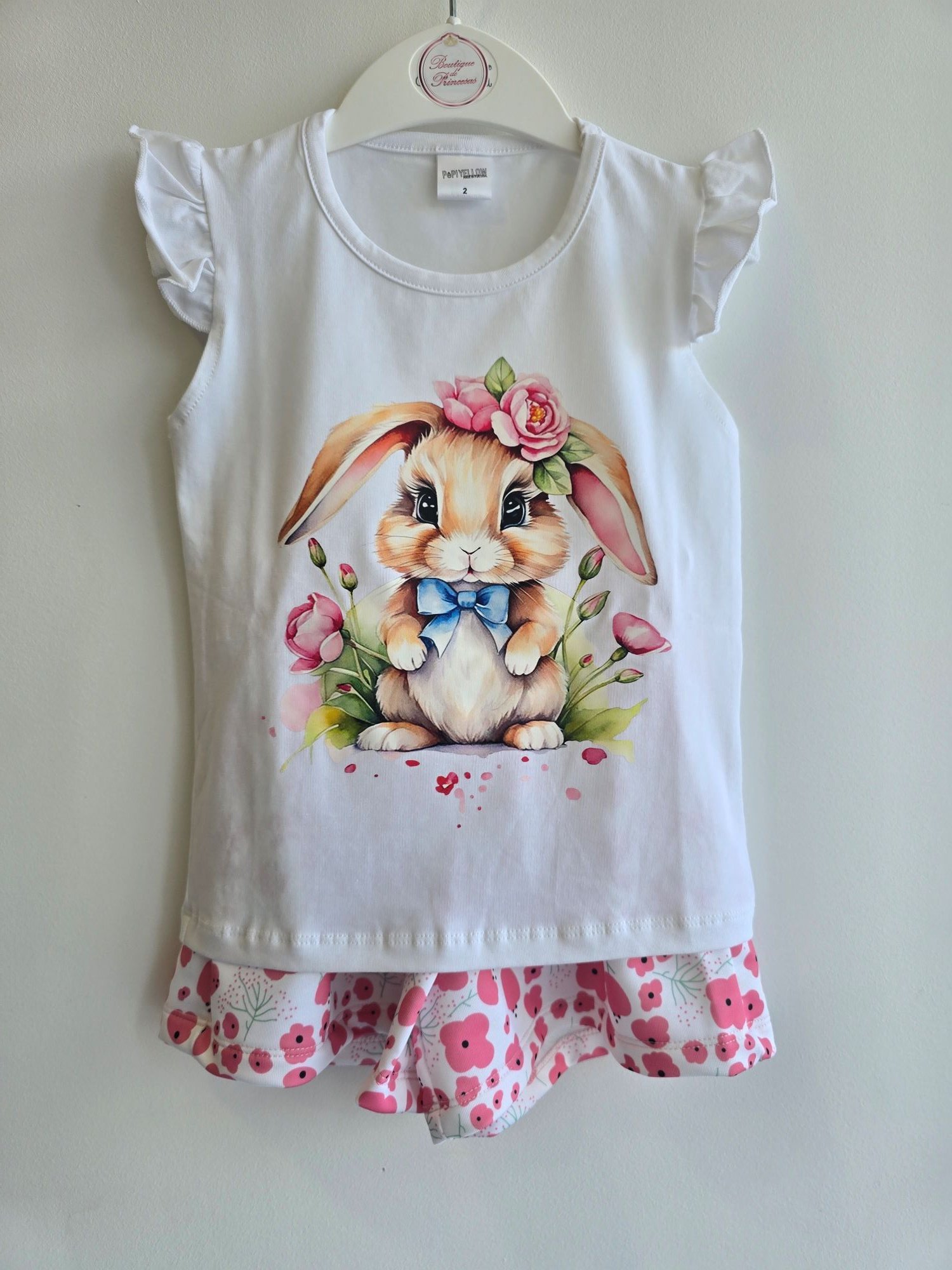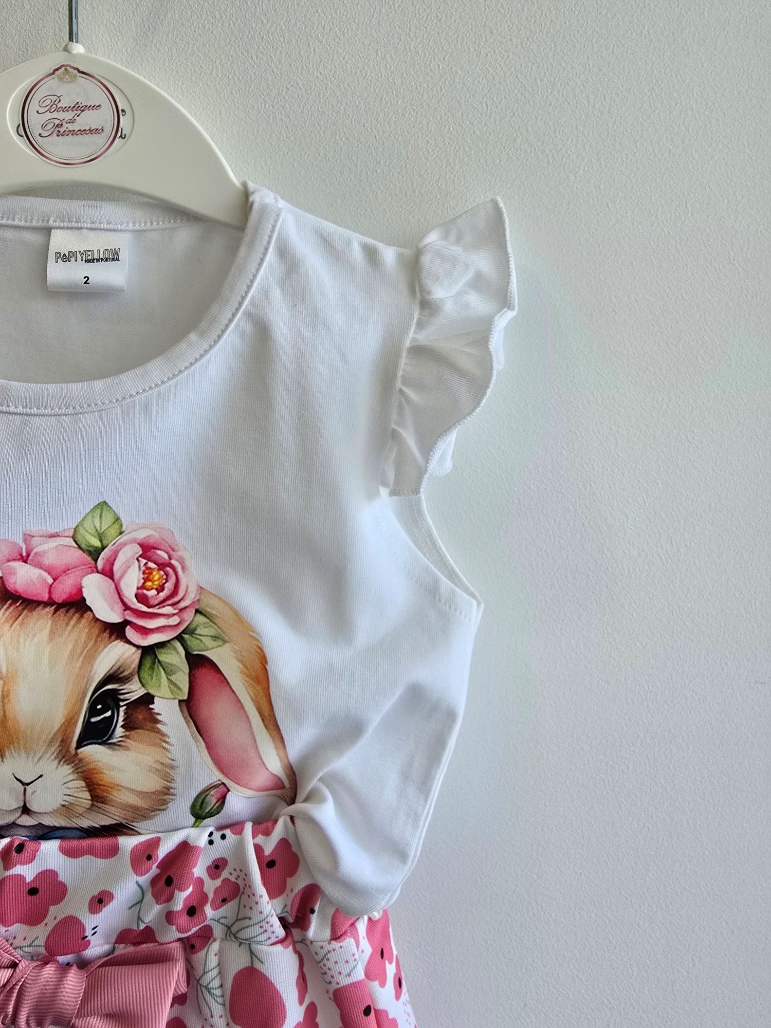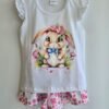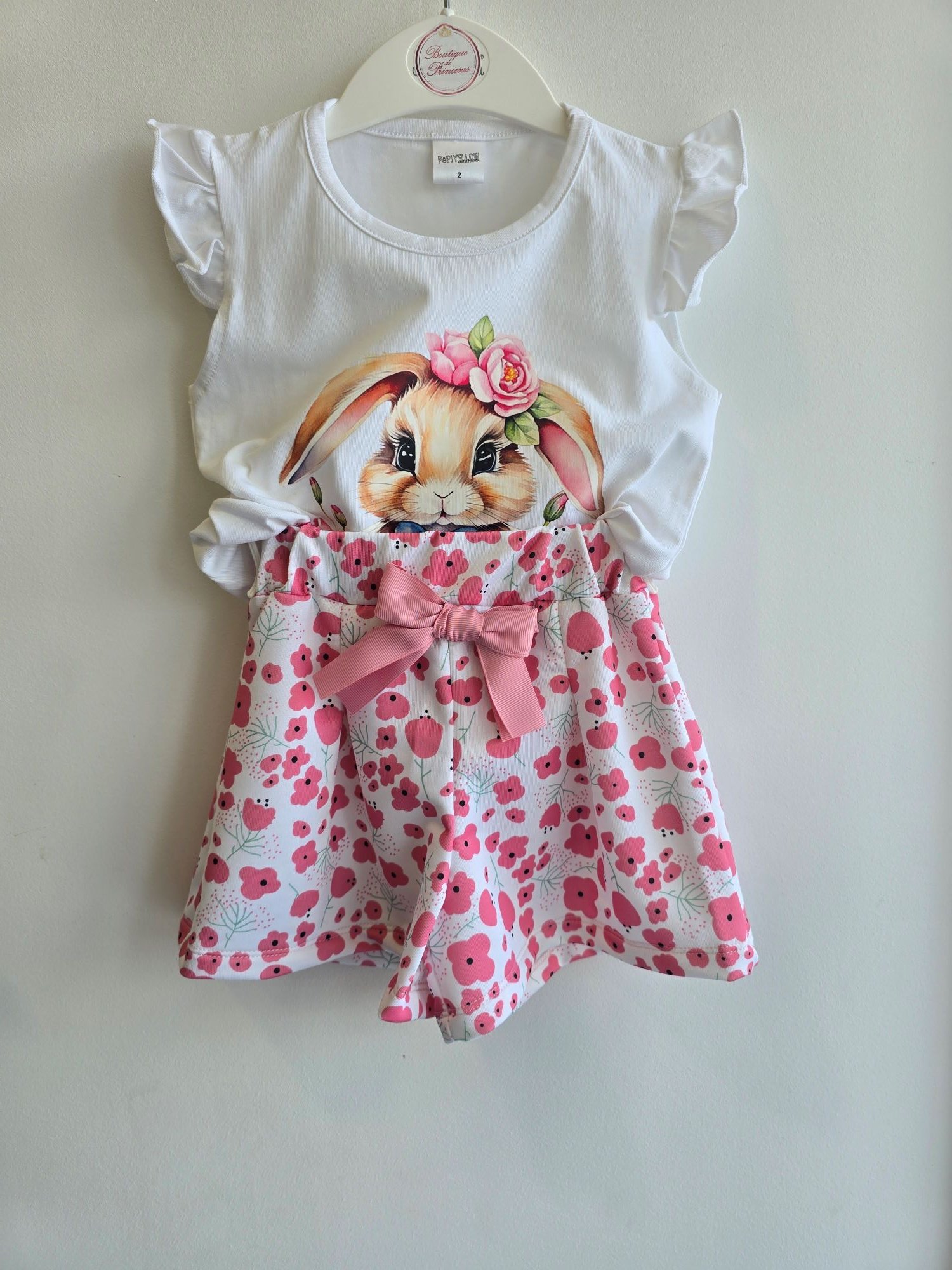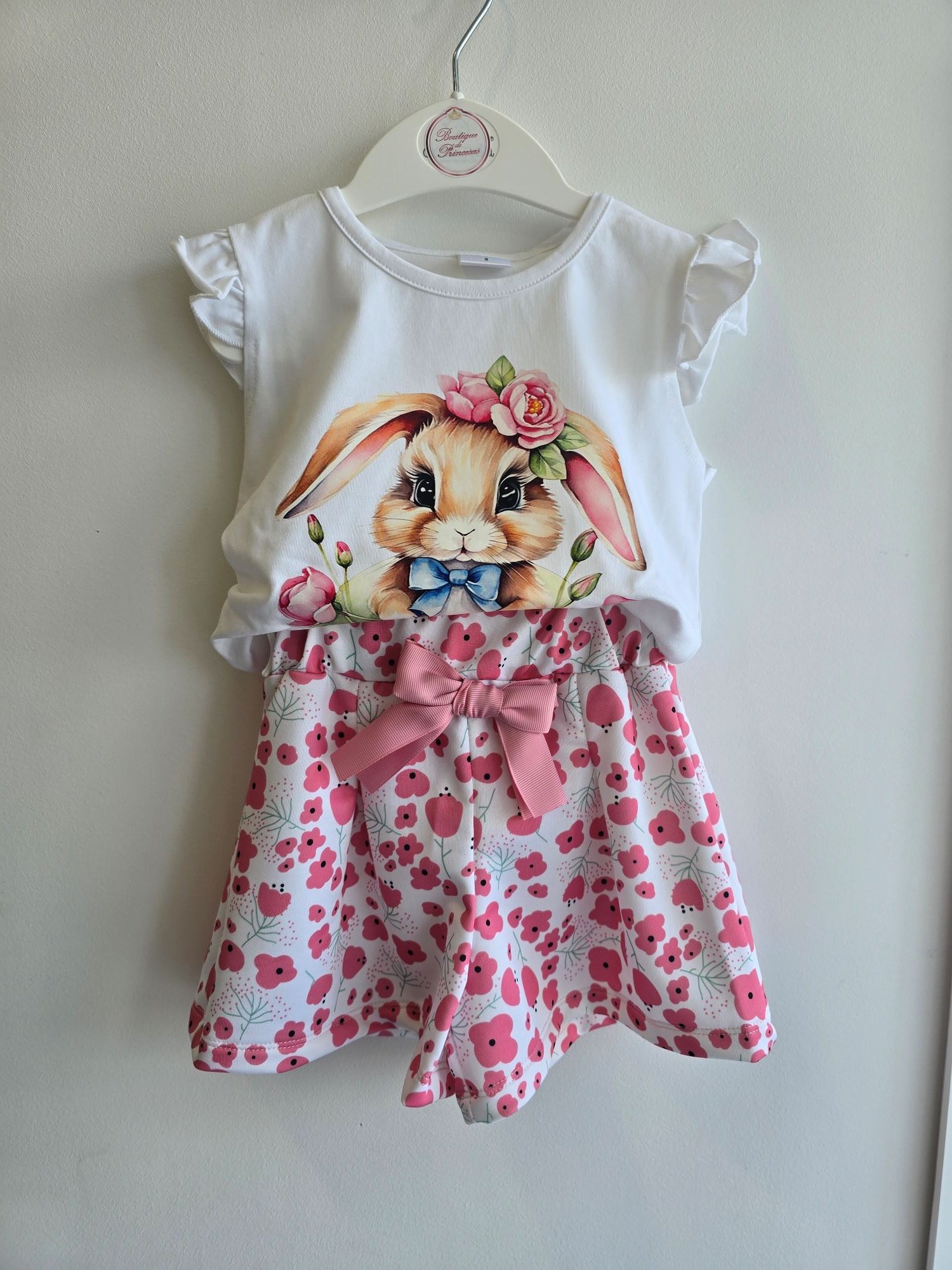 Conjunto composto por calções com pormenor de estampagem de flores e laço em 3d e camisola com estampagem de coelhinho e folhos nas mangas.