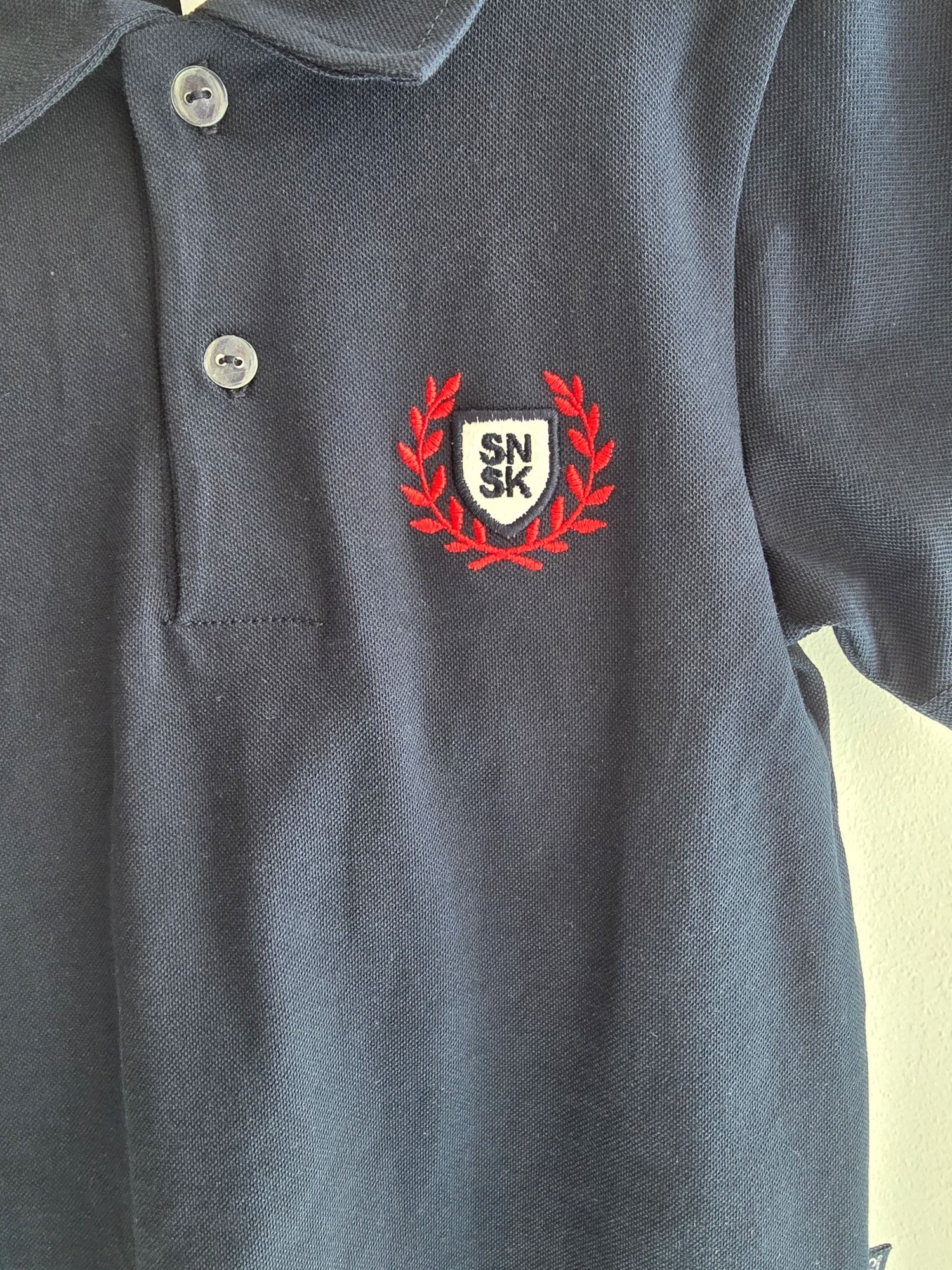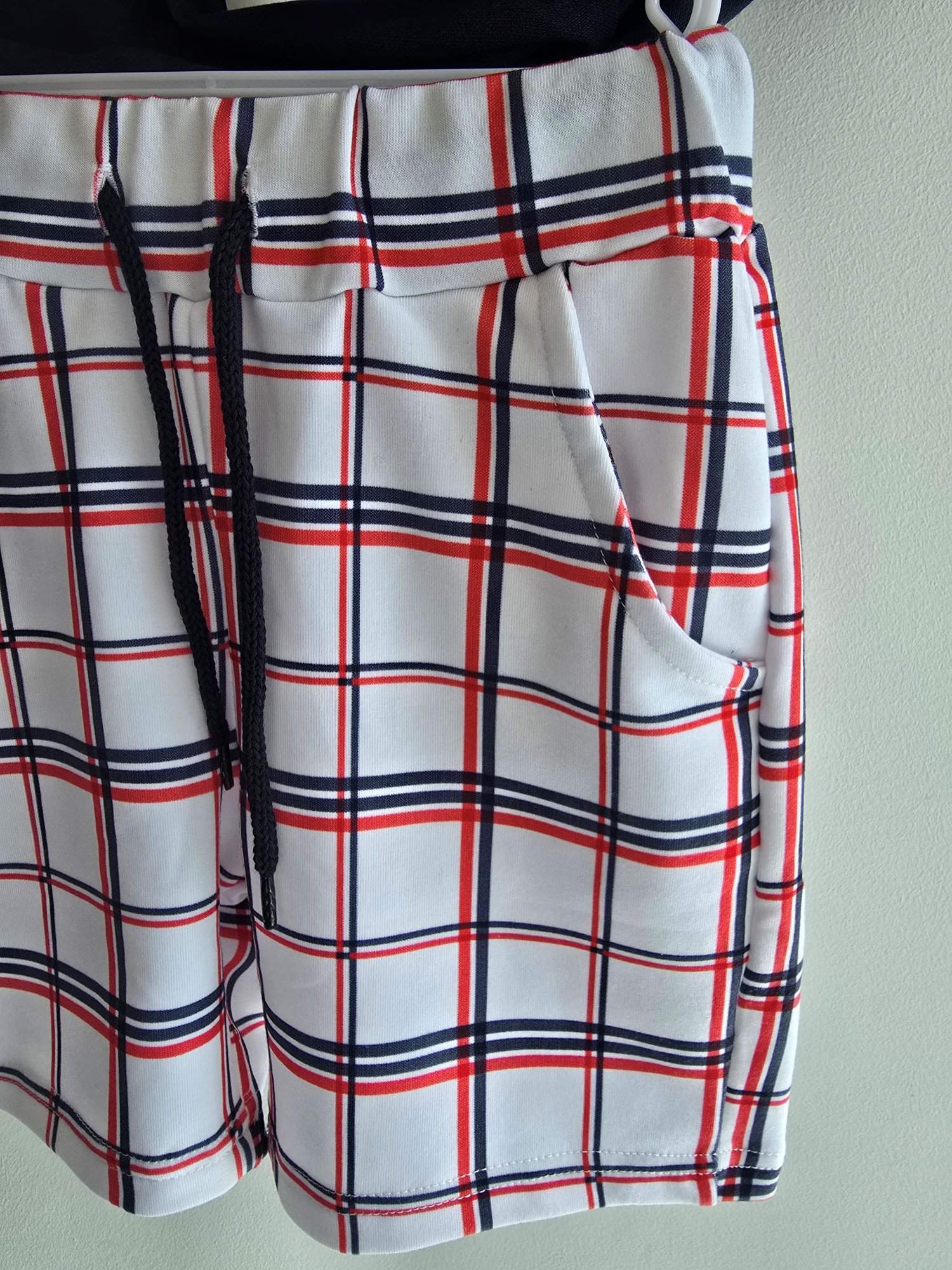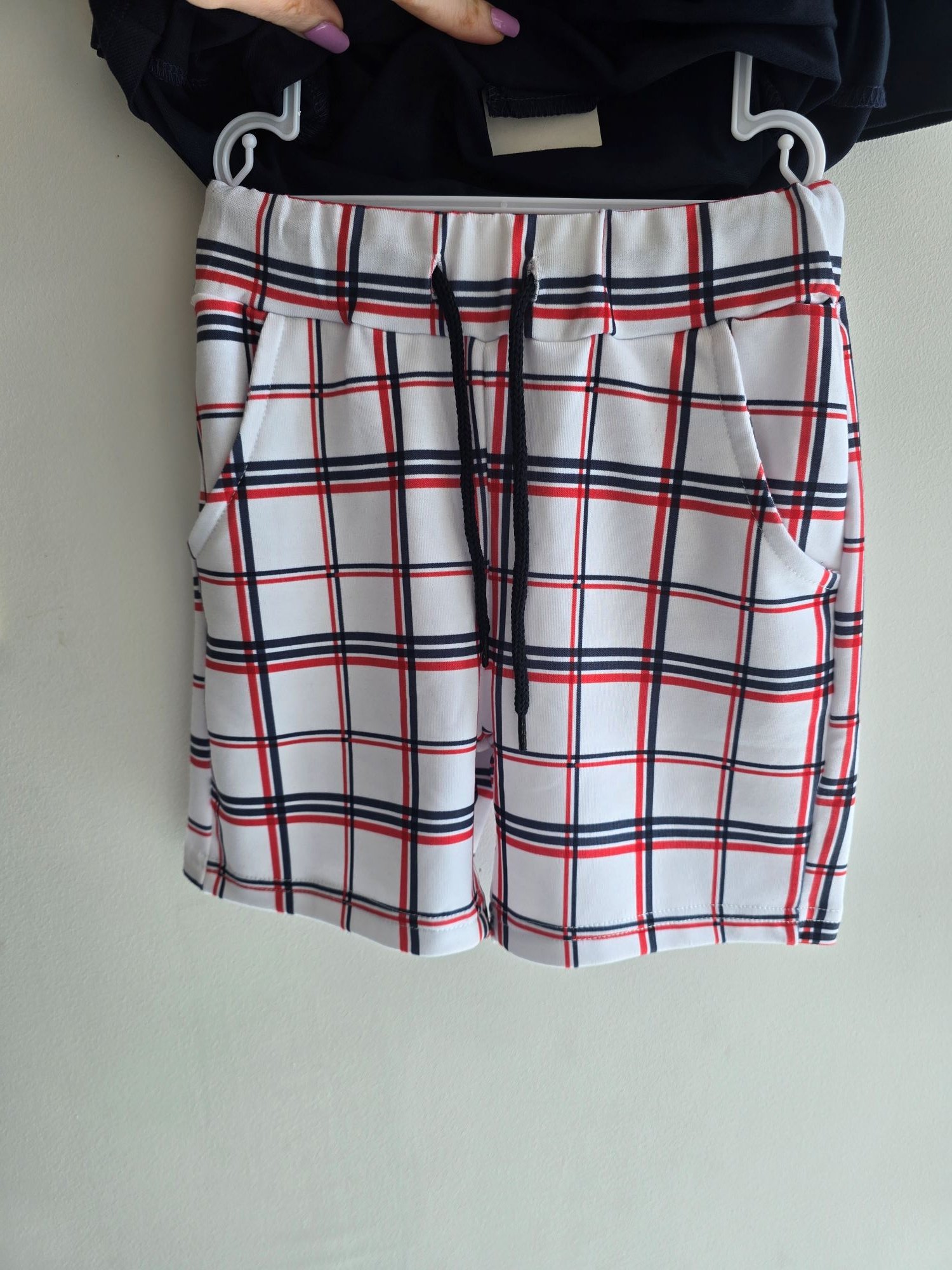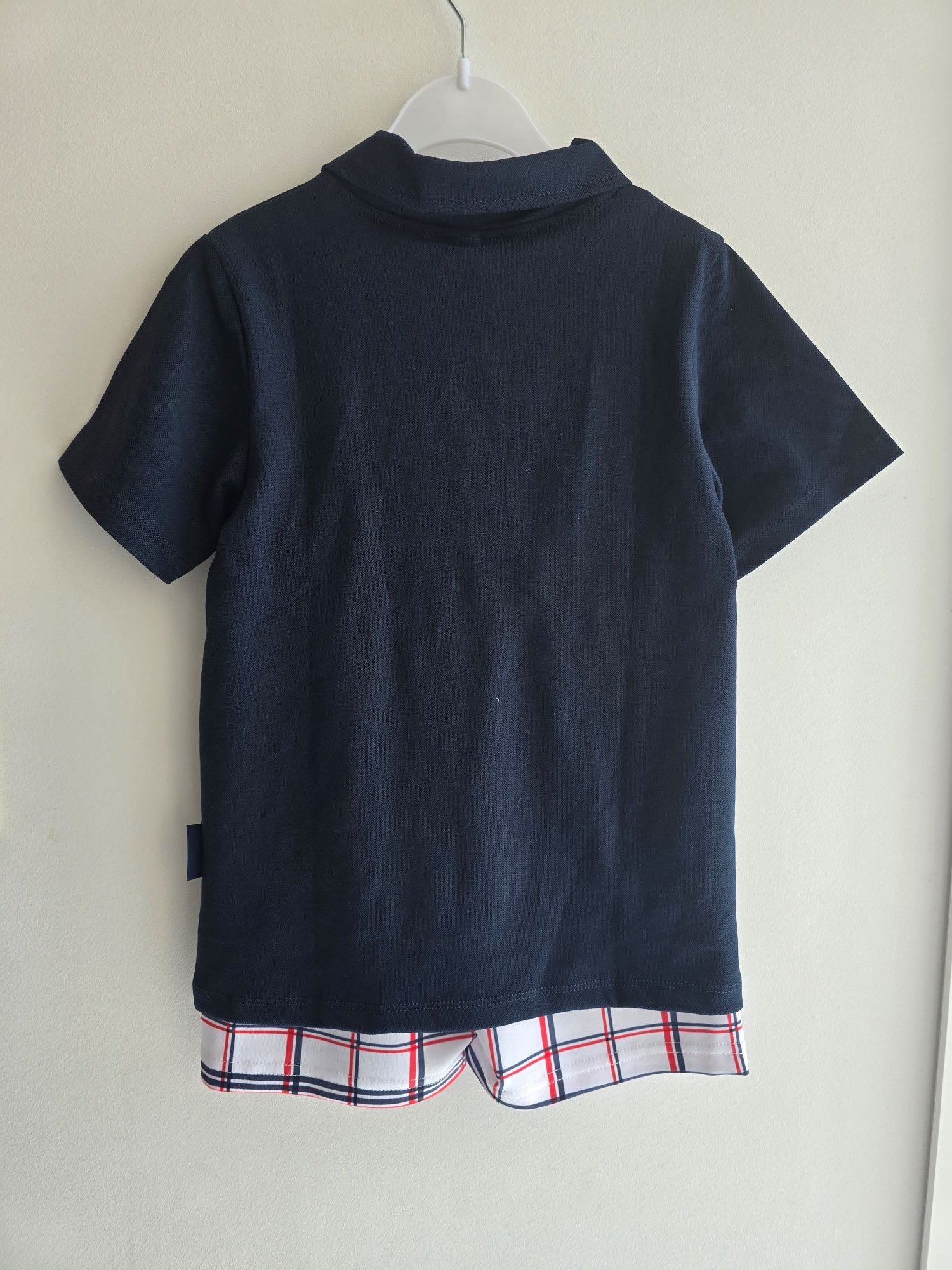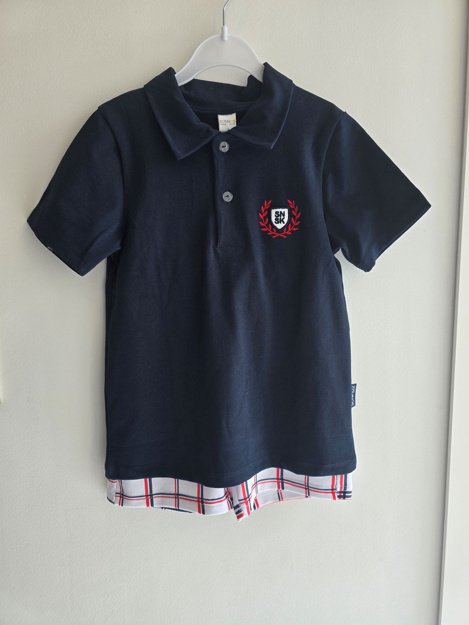 Conjunto composto por polo com botões e calções com bolsos e elástico na cintura.