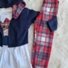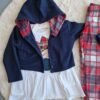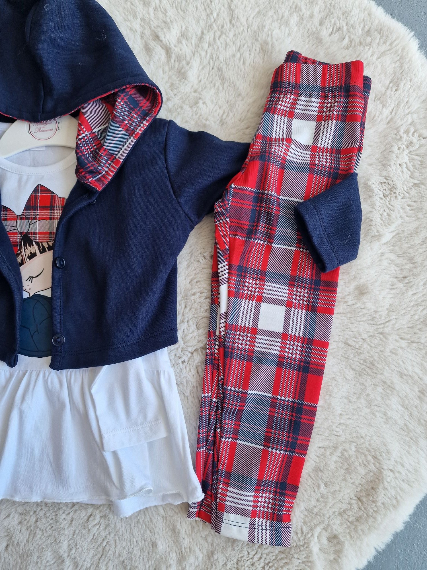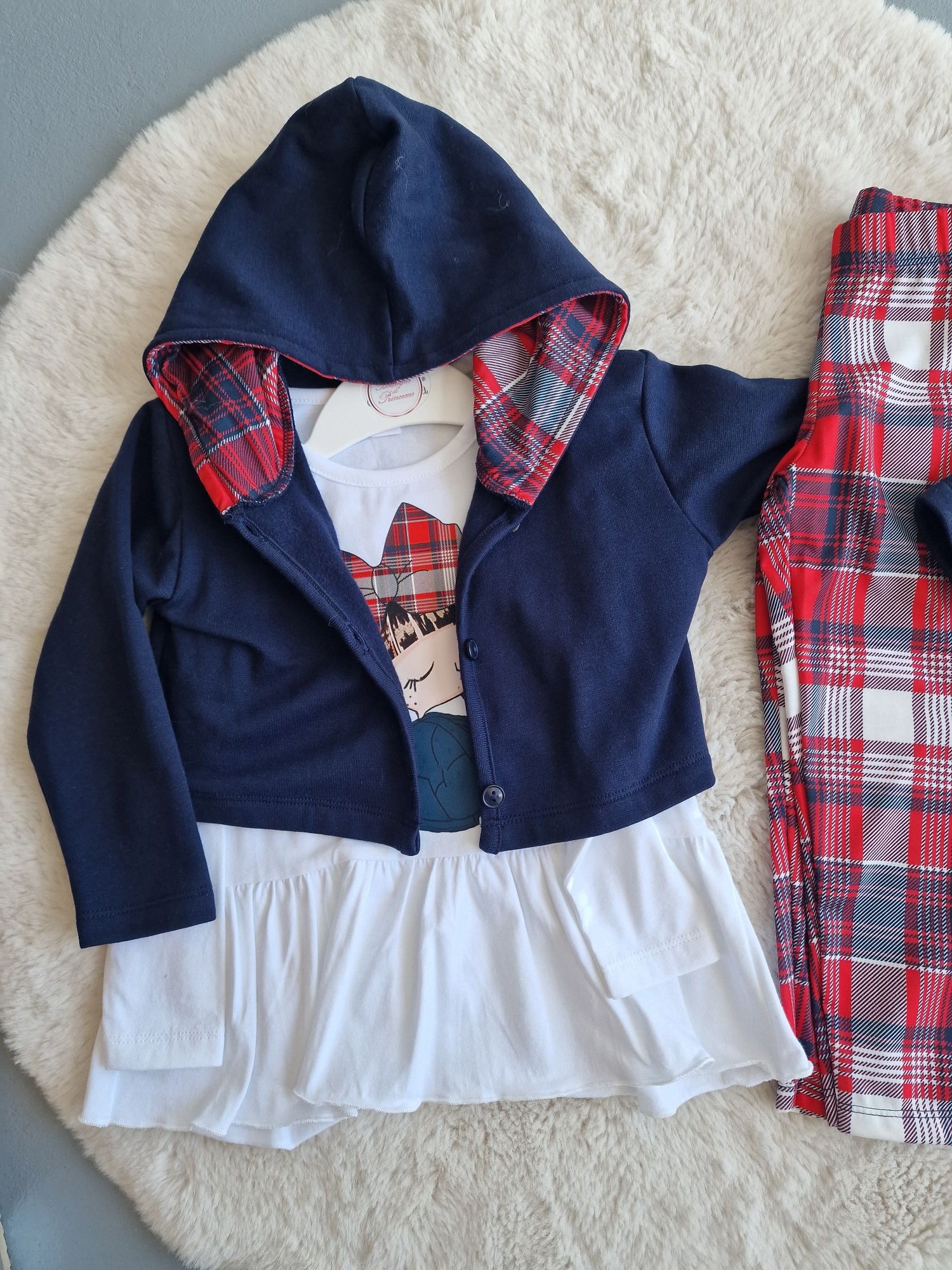 Conjunto composto por calças, camisola de maga comprida e casaco com capuz, artigos com carda.