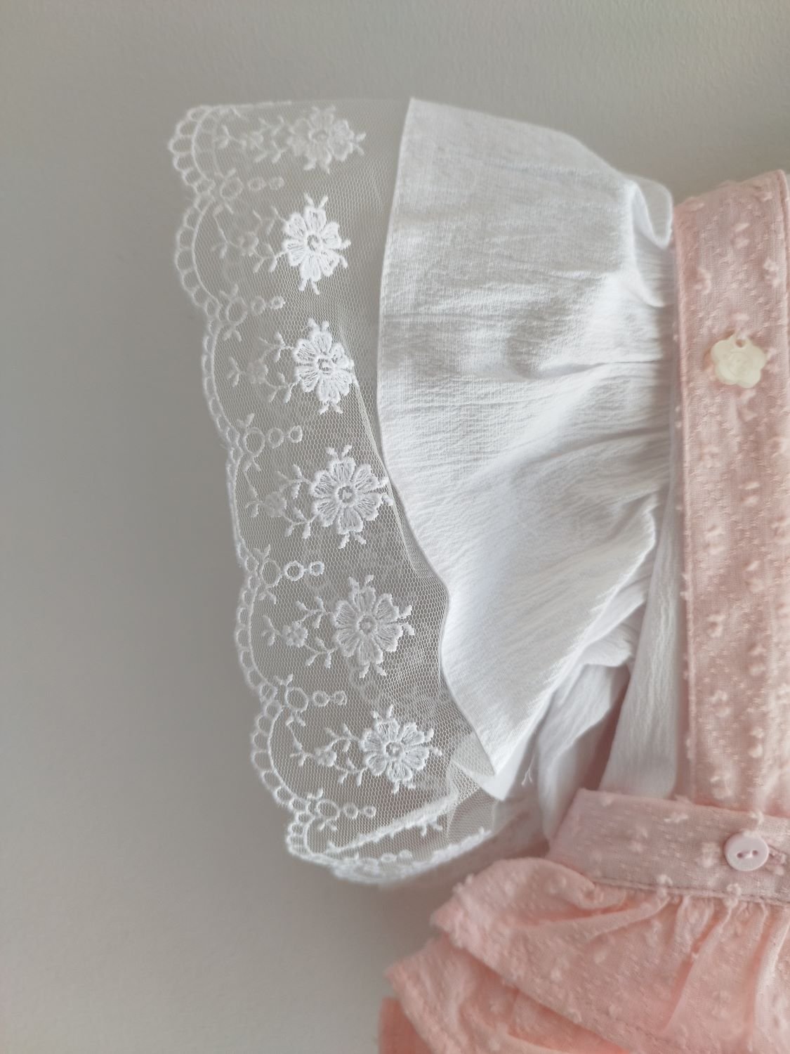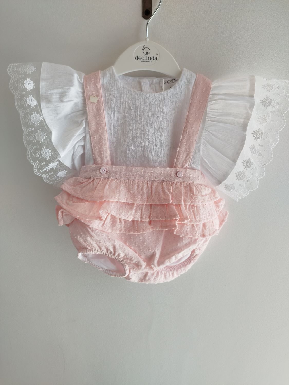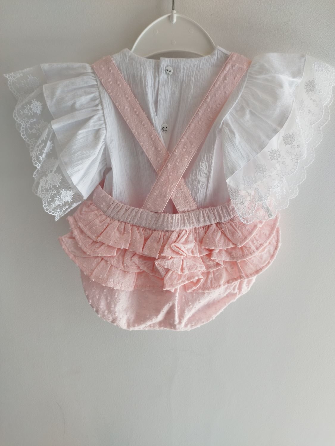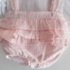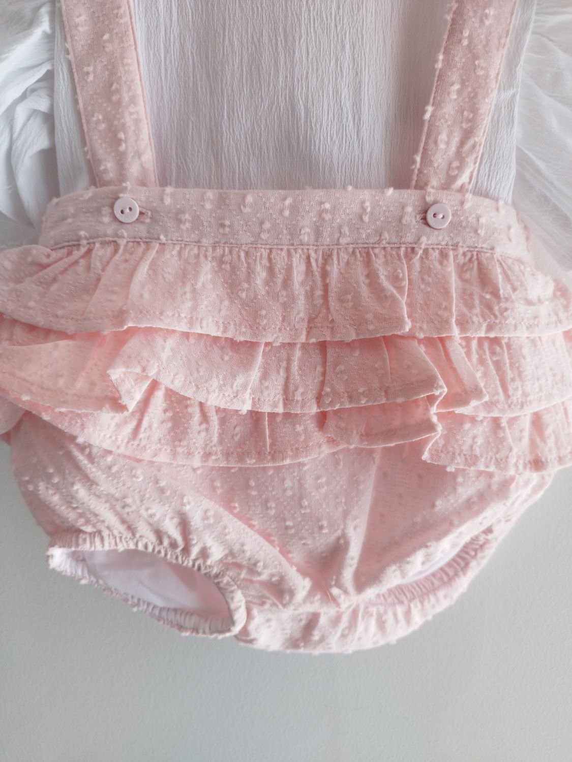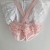 Conjunto composto por blusa com pormenor de renda nas mangas e tapa-fraldas com folhos.