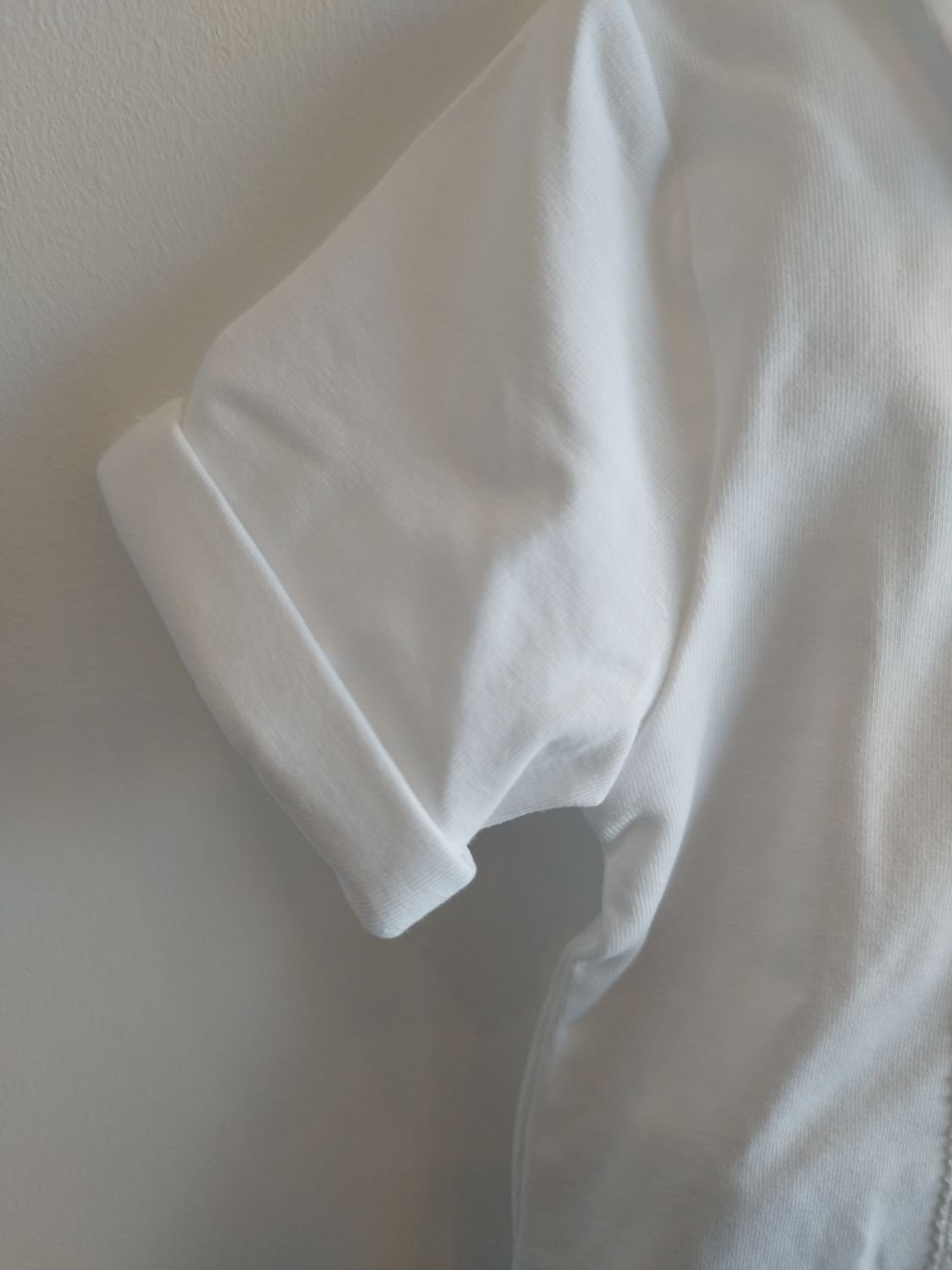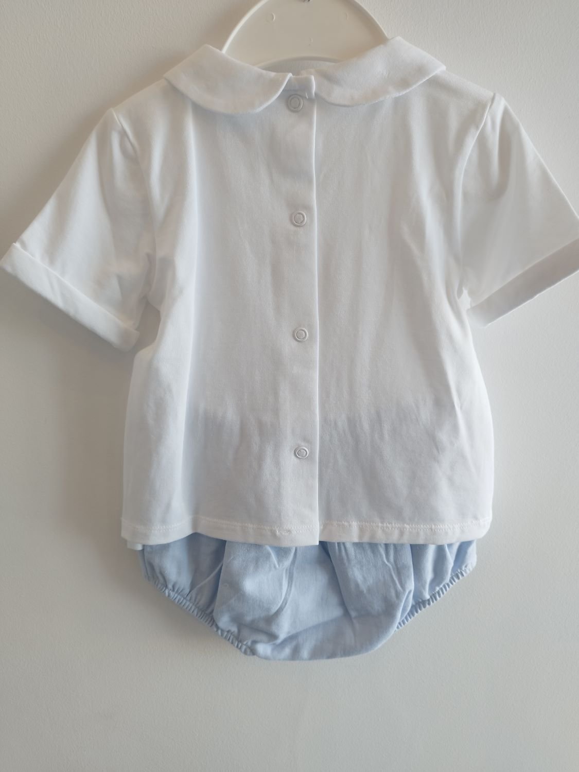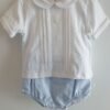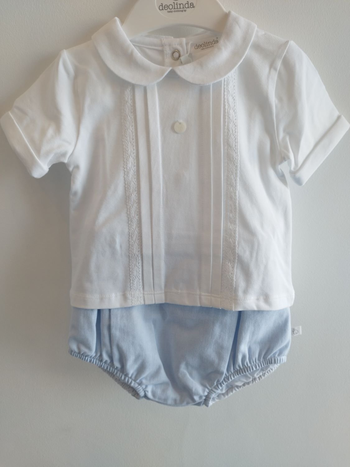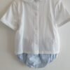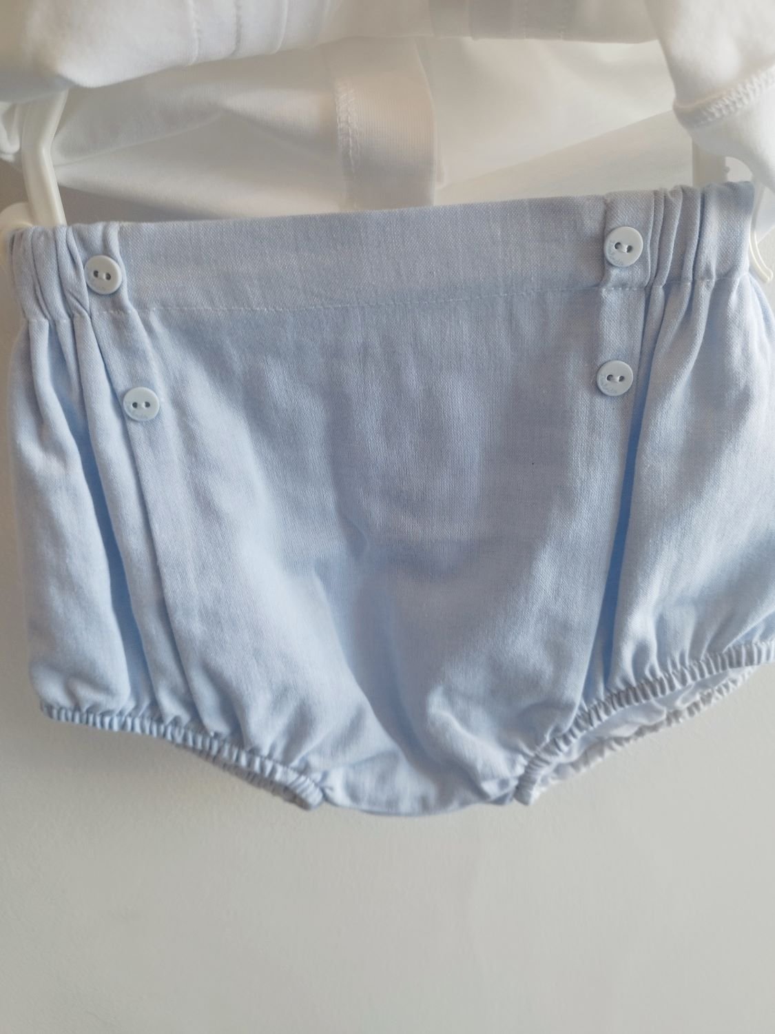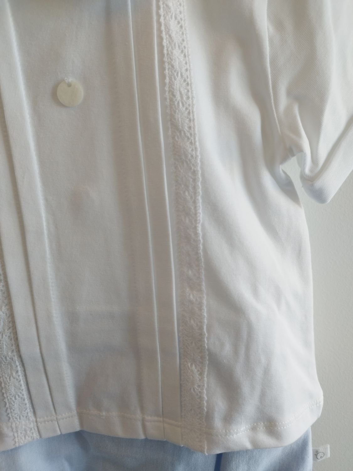 Conjunto composto por camisola com pormenor de renda e tapa-fraldas com botões.